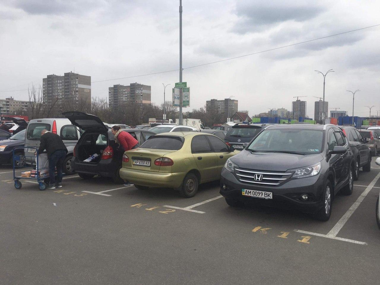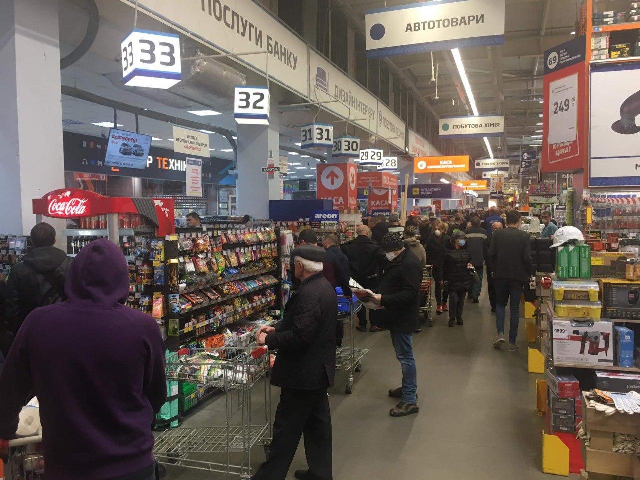 На фотографиях видно, что в магазине очень много людей, на кассах очереди, а на парковке практически не осталось свободного места. Что именно покупали украинцы и почему такой ажиотаж неизвестно, наверное из-за карантина люди решили массово закупить товары.
