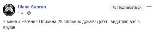 "У меня с Евгенией Плихиной 29 общих друзей! Сутки и удаляю вас из друзей", - написала бывшая в. о. министра здравоохранения Ульяна Супрун.