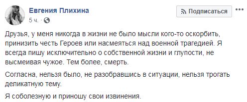 После того, как заявление Плихиной стало достоянием общественности, она решила извиниться в Facebook.