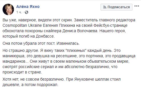 "Я вижу таких "плихиных" каждый день. Это маникюрша, это девушка на ресепшине, это портниха, это продавщица мандаринов... Они живут в своем маленьком обывательском мирке, смотрят российские сериал и им абсолютно безразлично, что происходит в стране", - прокомментировала Яхно.