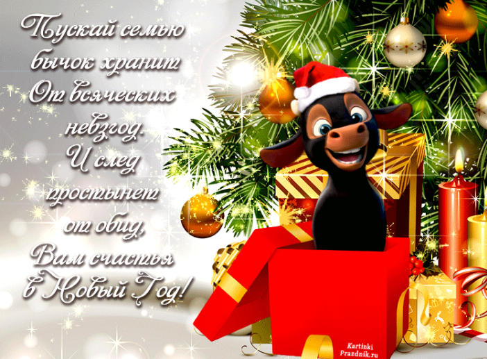 Пусть год Быка станет для вас мощным рывком вперед, ведь бык - сильное животное, идущее напролом не замечая препятствий! Пусть настойчивость в достижении целей поможет преодолеть любые помехи на пути, неумолимо двигаться к мечте! Пусть здоровье будет крепким, воля - несгибаемой, счастье - безусловным, а энергия бьет через край! Удачного и успешного года!