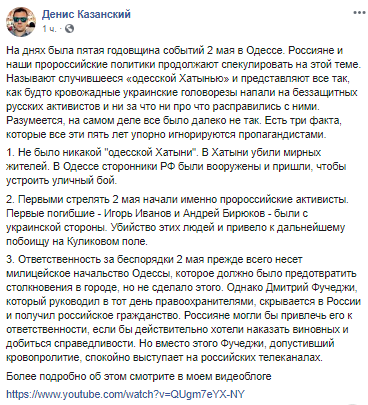 "На днях была пятая годовщина событий 2 мая в Одессе. Россияне и наши пророссийские политики продолжают спекулировать на этой теме. Называют случившееся "одесской Хатынью" и представляют все так, как будто кровожадные украинские головорезы напали на беззащитных русских активистов и ни за что ни про что расправились с ними. Разумеется, на самом деле все было далеко не так. Есть три факта, которые все эти пять лет упорно игнорируются пропагандистами", - написал журналист.