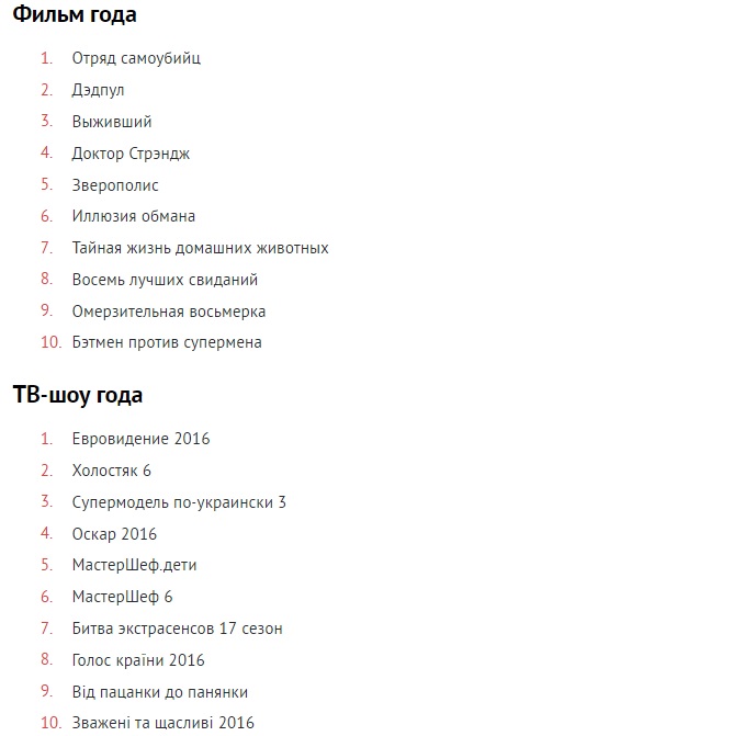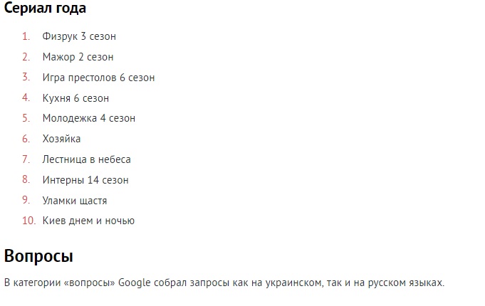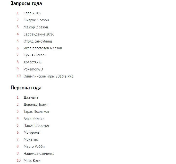 Рейтинг запросов украинцев был составлен с помощью сервиса Google Zeitgeist. Отмечается, что рейтинг поисковых запросов указывается в относительном выражении, а не абсолютном. Это значит, что данные запросы в течение 2016 года росли быстрее всего и показывают всплеск интереса украинцев к определенным событиям, персонам и вопросам.
