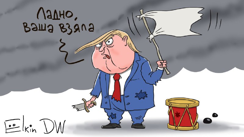 В своей работе он изобразил Трампа со сломанным оружием и с поднятым белым флагом.