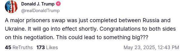 "Только что между Россией и Украиной был завершен большой обмен пленными. Он вступит в силу в ближайшее время. Поздравляем обе стороны с этими переговорами. Это может привести к чему-то большому???", - говорится в сообщении.