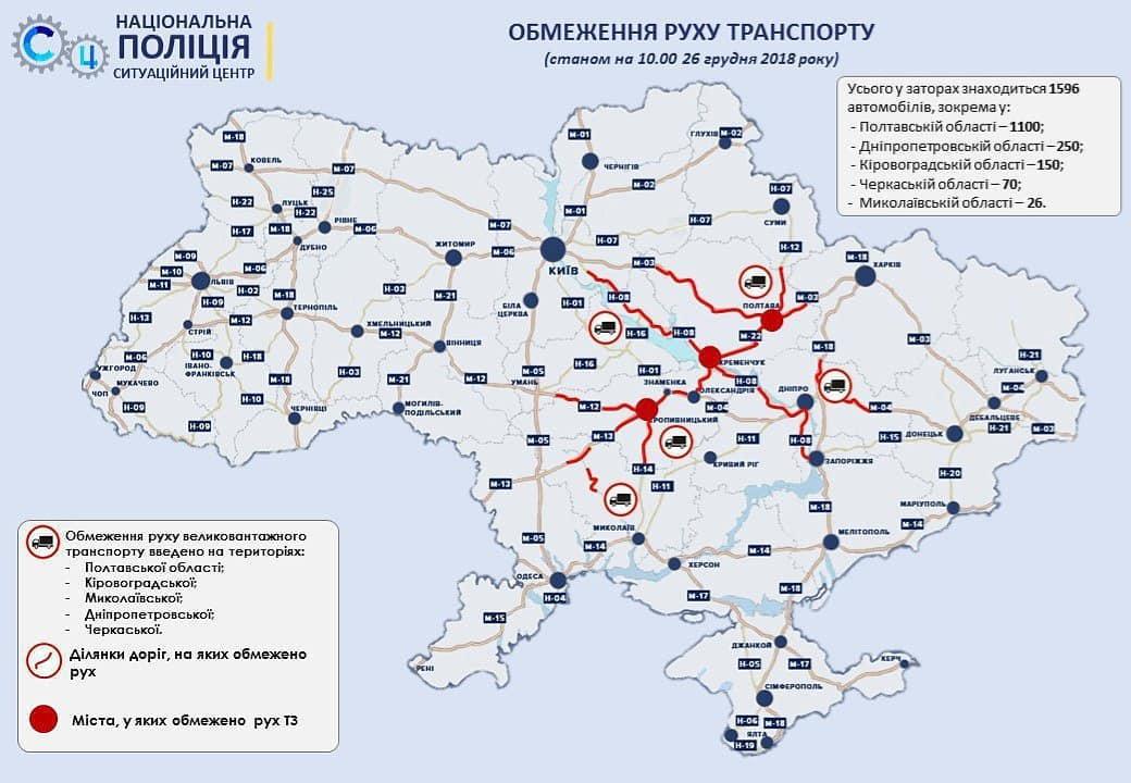 "Ловите оперативную информацию о последствиях непогоды на дорогах страны. Пока в пробках стоит более 1,5 тысячи авто. Больше транспортный коллапс касается автодорог Полтавской области. Но мы вместе со спасателями рядом и помогаем водителям. У меня к вам большая просьба - без необходимости не выезжайте на дальние расстояния и планируйте маршруты движения заблаговременно. Чтобы ориентироваться в ситуации ловите карту с актуальной информацией", - говорится в сообщении.