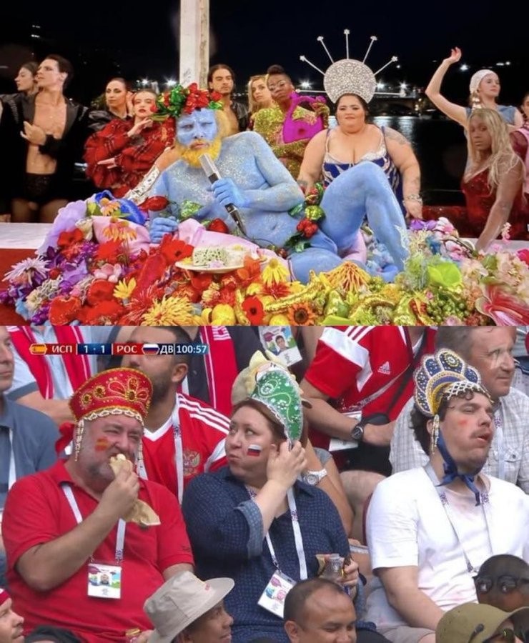 На первом фото среди "драг-королев, в образе бога Диониса - певец Филипп Катрин, появившийся в нижнем белье, почти обнаженным и окрашенным в синий цвет. На втором фото болельщики сборной РФ на матче с Испанией на Чемпионате мира по футболу 2018 года.