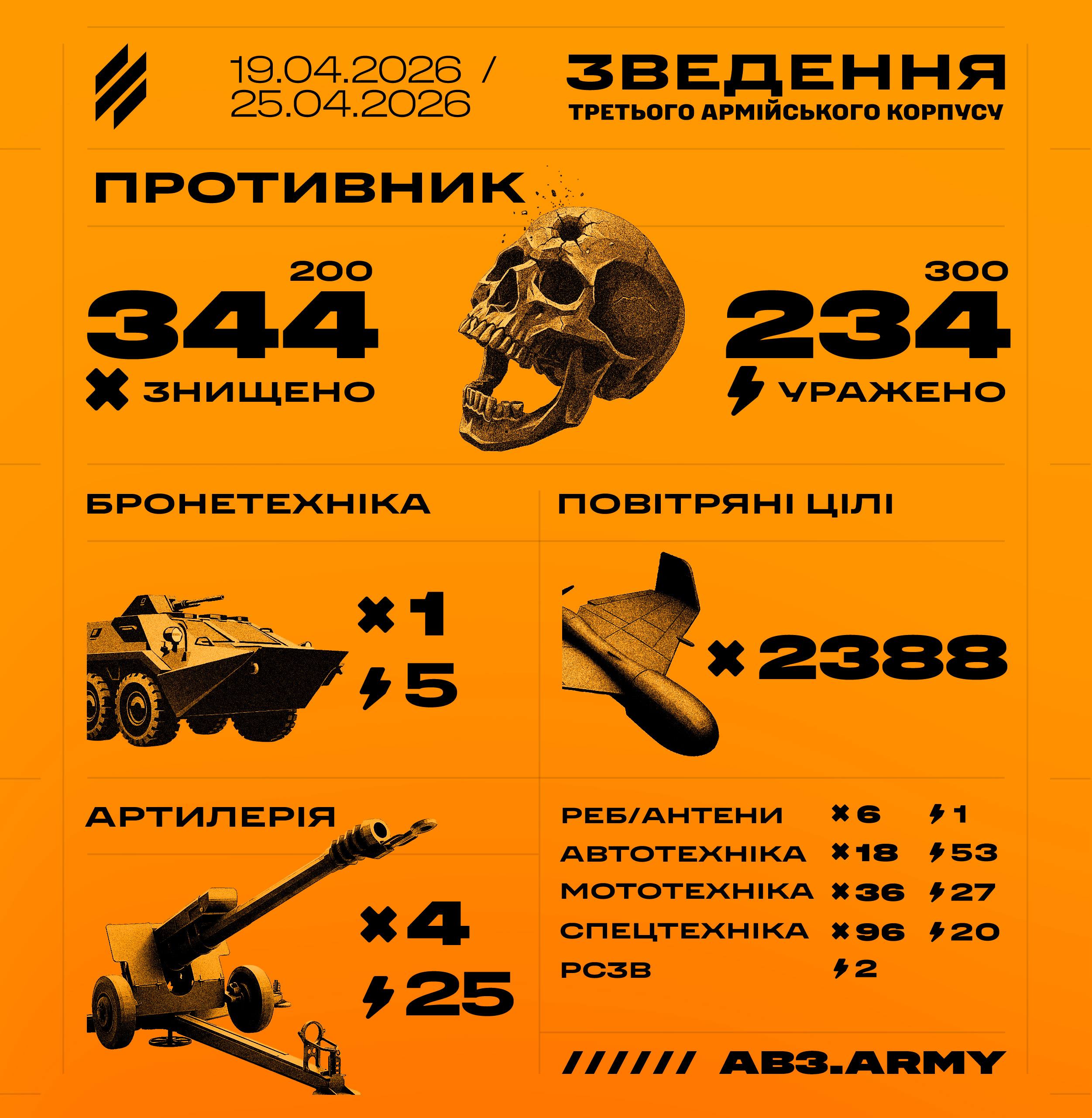 "Более 2500 единиц российского вооружения и техники России уничтожили за неделю! Это новые потери врага в 150-км полосе фронта Третьего армейского корпуса. Армия РФ уменьшилась на 578 окупантов, из которых 344 — безвозвратно. Еще 6 Тройка взяла в плен", — говорится в сообщении.