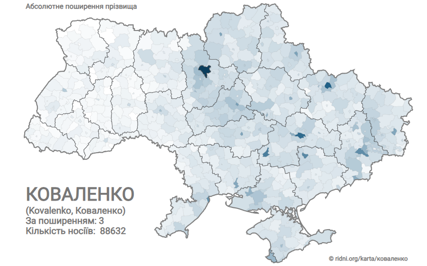 Фамилия Коваленко является третьей по распространенности в Украине. Ее носителями являются восемьдесят восемь тысяч шестьсот тридцать два украинца.