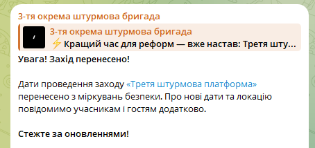 Ранее в 3 ОШБр анонсировали первую Платформу реформ от Третьей штурмовой, запланированную на 20 марта. На ней должен был выступить командующий Третьим Армейским Корпусом Андрей Билецкий, а также опытные боевые офицеры.