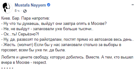 "Любите и цените свободу, которую добились. Вместе. А тем, кто вышел вчера в Москве – respect", - подытожил Найем.