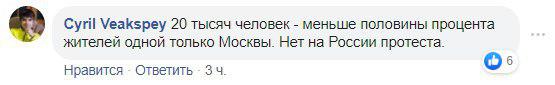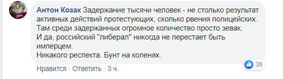 "Задержание тысячи человек - не столько результат активных действий протестующих, сколько рвения полицейских. Там среди задержанных огромное количество просто зевак. И да, российский "либерал" никогда не перестает быть имперцем. Никакого респекта. Бунт на коленях", "20 тысяч человек - меньше половины процента жителей одной только Москвы. Нет на России протеста", "Молодежь поднялась вот что важно а они это другое поколение", - в таком духе пишут комментаторы.