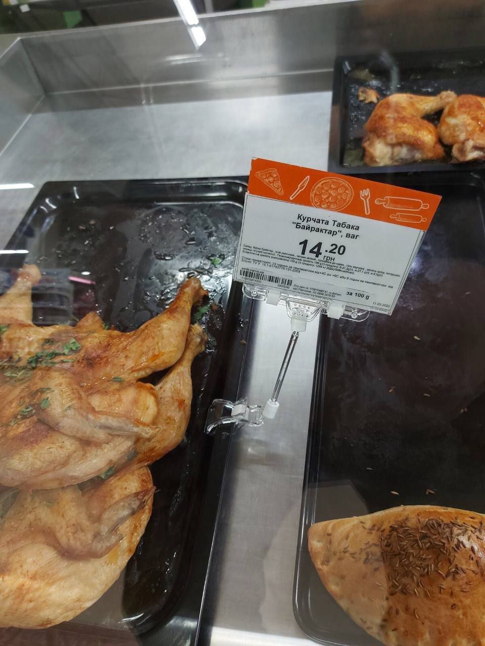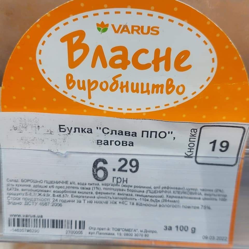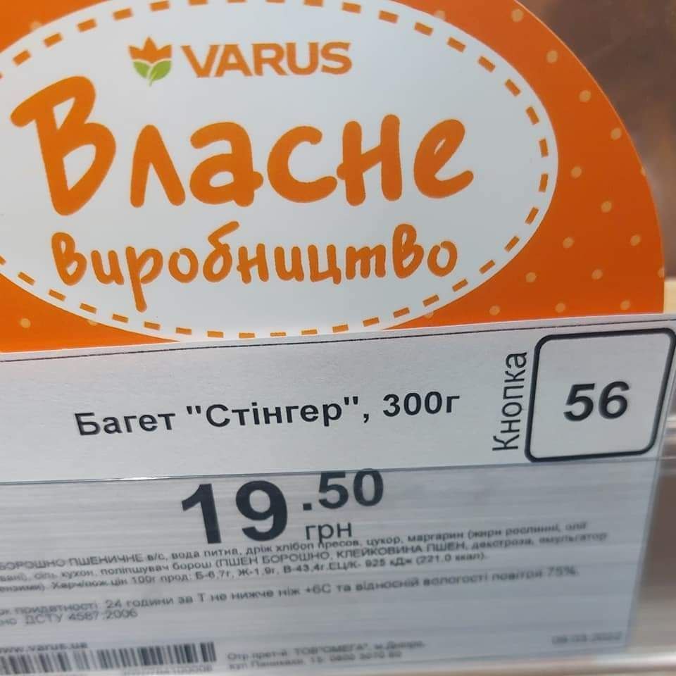 Так, на прилавках сети продуктовых магазинов сети Varus появились булка "Слава ПВО", багет "Стингер" и мясо цыплят табака "Байрактар". Их стоимость составляет 6.29, 19.50 и 14.20 гривен, соответственно.