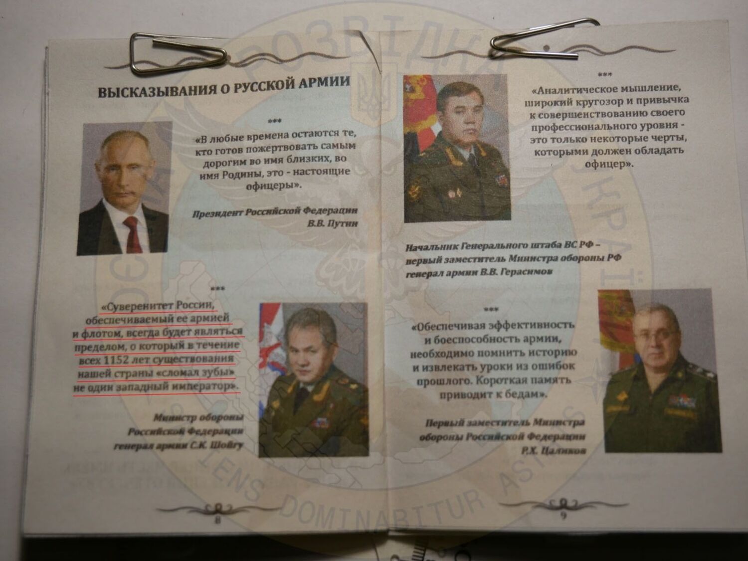 В "кодексе" также содержатся пропагандистские цитаты военно-политического руководства государства-оккупанта: Путина, Шойгу и других. Так, министр обороны России Шойгу утверждает, что "Россия существует уже 1152 года и об нее сломал зубы не один западный император".