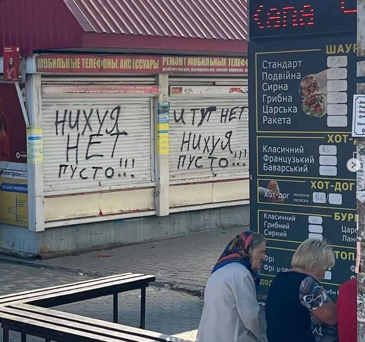 Другие фото иллюстрируют крик души местных жителей: на роллетах киоска, где раньше был ремонт мобильных телефонов, надпись: "Ни**я нет, пусто!", рядом - такая же надпись.