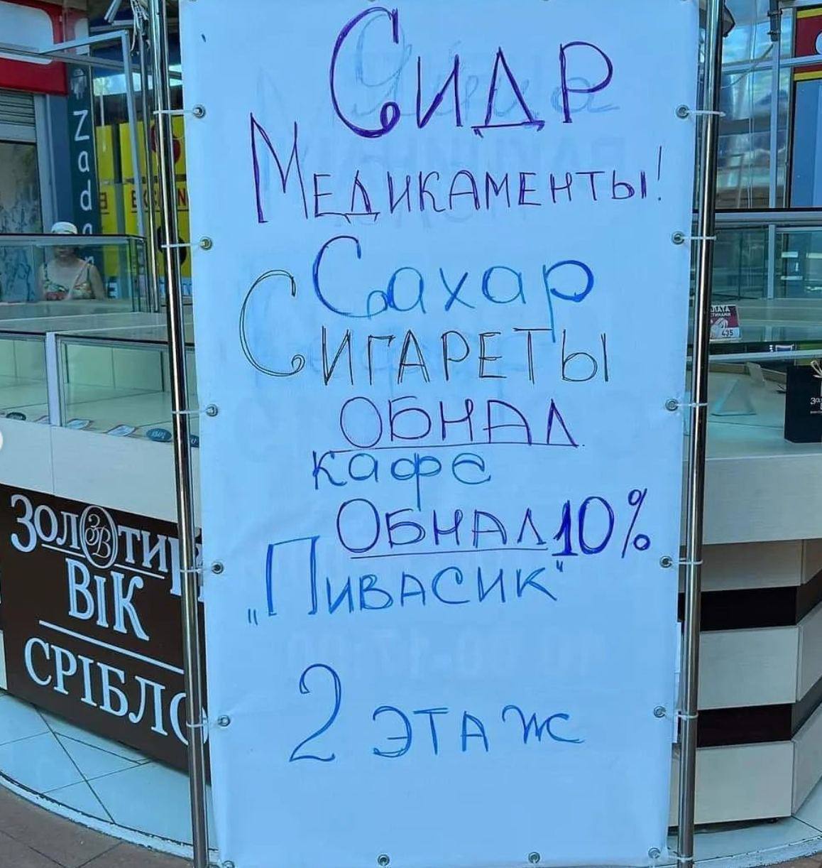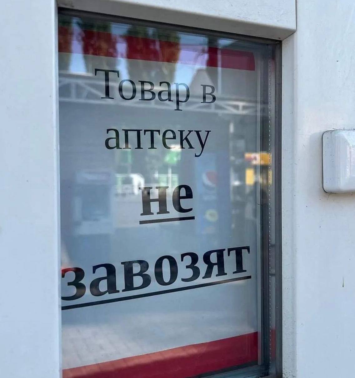 На снимке из аптеке можно увидеть объявление, что медикаменты не завозятся. Также в городе процветает подпольная торговля алкоголем, продуктами и сигаретами, и обналичивание денег за плату в 10%.