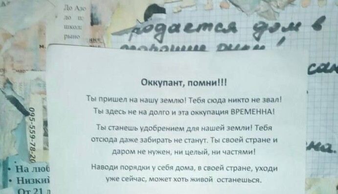 "Оккупант, помни! Ты пришел на нашу землю! Тебя сюда никто не звал! Ты здесь не на долго и эта оккупация временна! Ты станешь удобрением для нашей земли! Тебя отсюда даже забирать не станут. Ты своей стране и даром не нужен, ни целый, ни частями!", - говорится в послании.