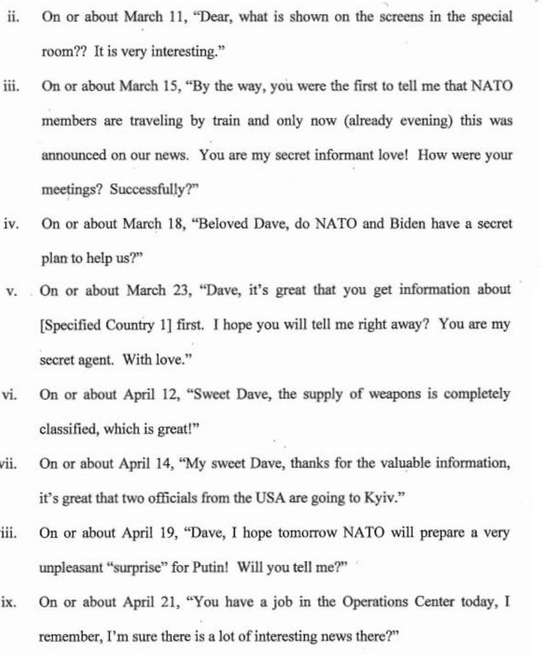 Его обвиняют в том, что он преднамеренно, неуместно и незаконно передавал засекреченную информацию, которая может нанести ущерб Соединенным Штатам или быть полезной другой стране, лицу на зарубежной онлайн-платформе для знакомств, которая не имела права получать такую информацию.