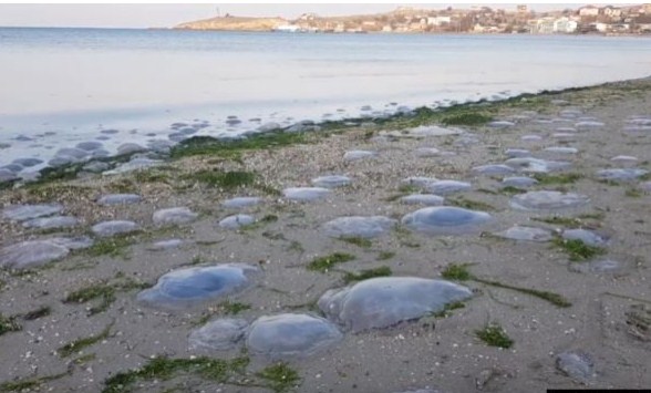 В оккупированном Крыму на азовское побережье выбросило тысячи медуз, берег буквально усеян морскими животными.