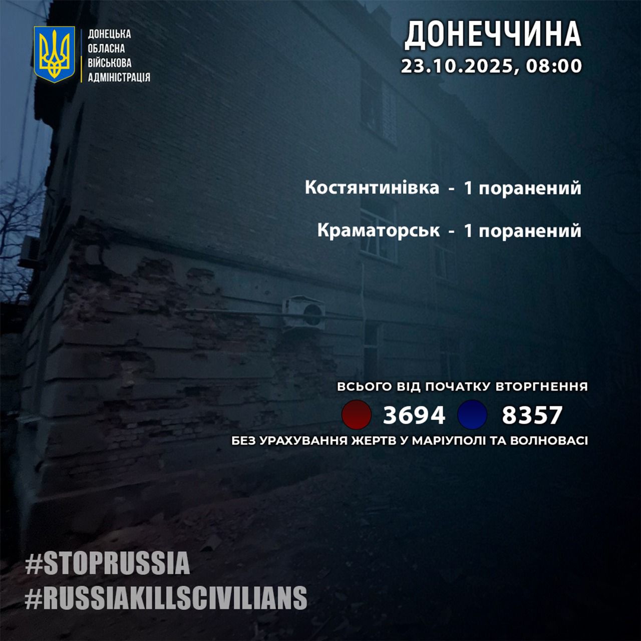 По официальным данным, с начала полномасштабного вторжения российских войск в Украину, в Донецкой области погибли по меньшей мере 3694 мирных жителей, еще 8357 человек получили ранения. Эти цифры не учитывают жертв в Мариуполе и Волновахе, где точные данные до сих пор невозможно установить из-за оккупации.