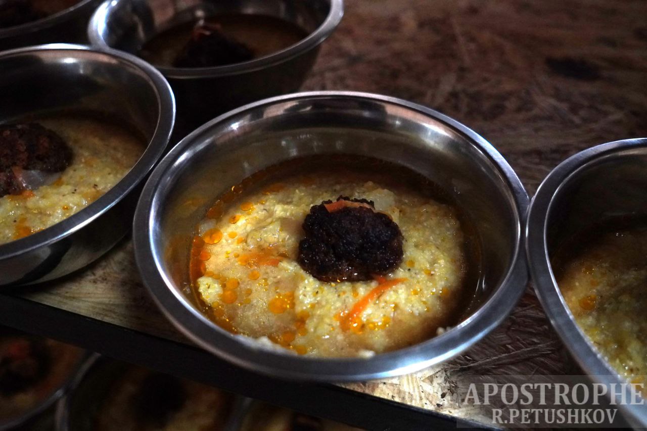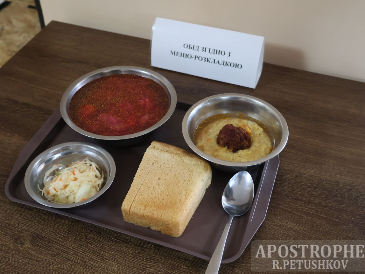В тот день, когда редактор и фотокорреспондент "Апострофа" посещали заведение, на обед подавали борщ, пшенную кашу с котлетой из натурального мяса и салат. На ужин ожидалась рыба с картофелем.