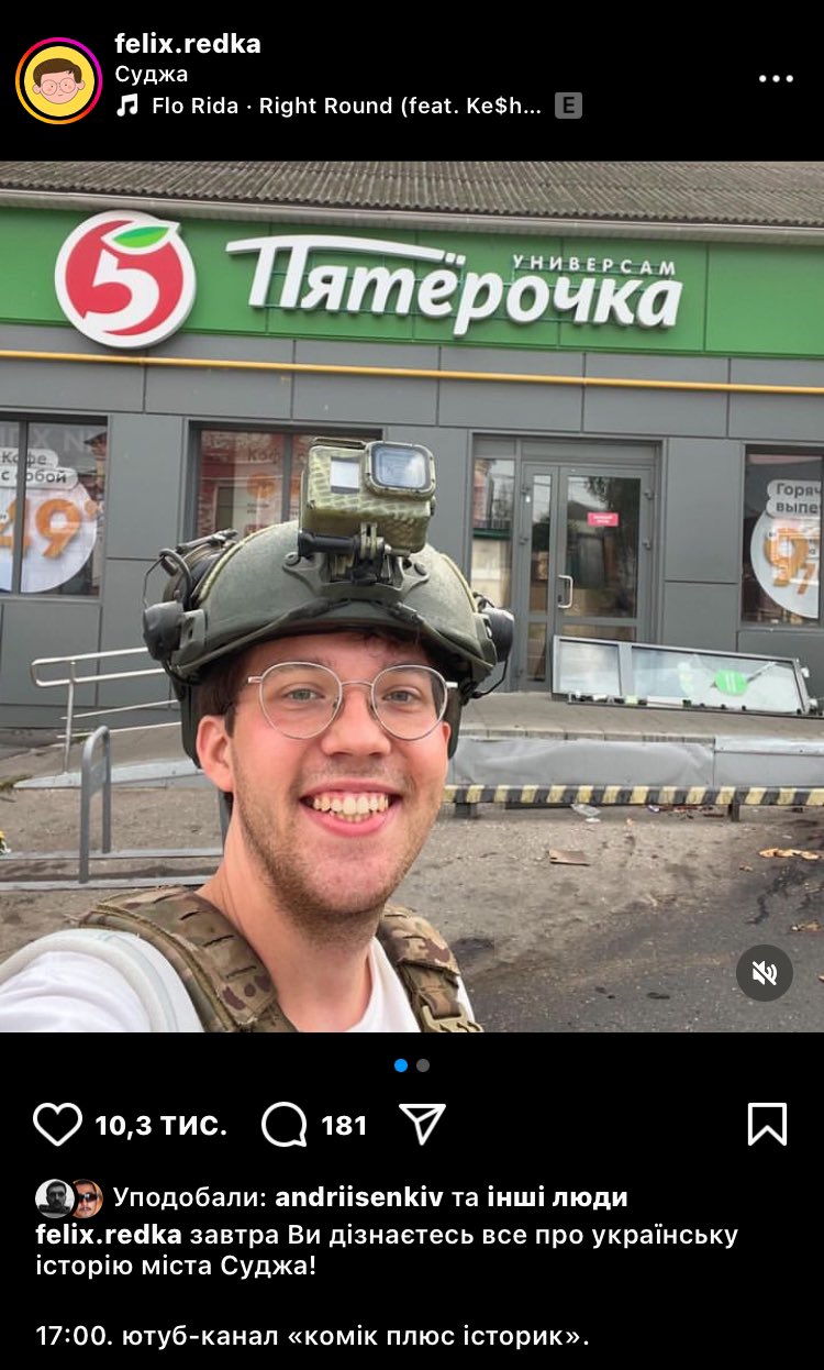 Украинский комик Феликс Редька появился в занятой ВСУ российской Судже и обещал рассказать об украинской истории города.