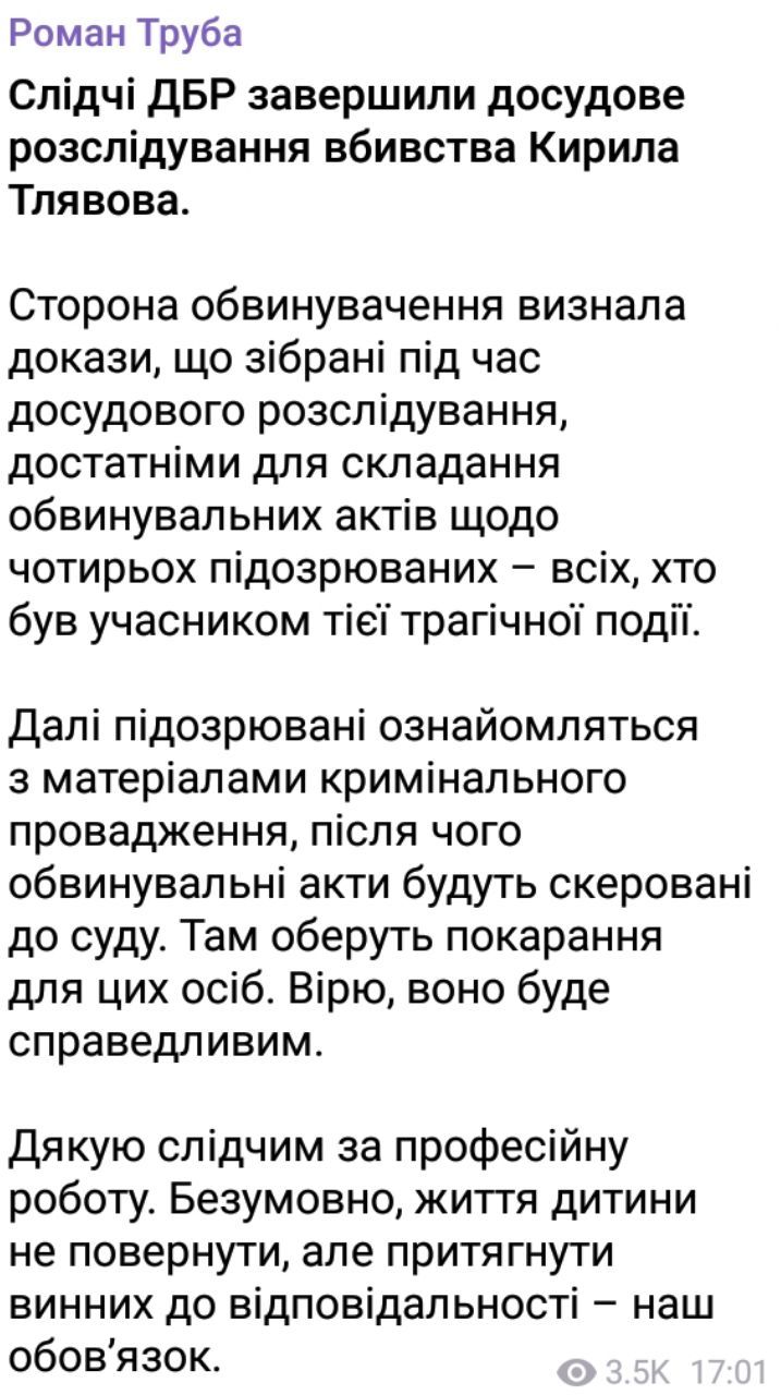 Роман Труба поблагодарил следователей за профессиональную работу и добавил, что, хотя жизнь ребенка и не вернуть, но виновные обязательно должны понести наказание.