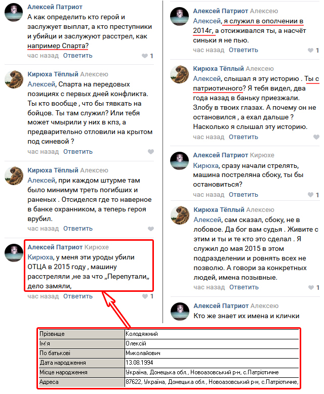 По словам участника этой переписки, который был идентифицирован как Алексей Колодяжный, с начала боевых действий на Донбассе в 2014 году он ушел воевать на стороне боевиков. А в 2015 году от рук его же соратников погиб отец, 35-летний Николай Колодяжный.