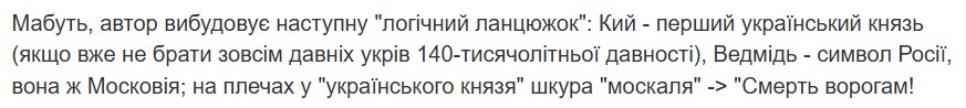 "Его автор явно не хотел думать и ничего знать, а хотел подтянуть и прогнуть реальность под свою фантазию о чем-то. Медведь был тотемным животным древних славян. Его имя также было запрещено упоминать всуе, как у иудеев - имя Бога, поэтому мы знаем лишь его описательное обозначение – "тот, кто знает, (где) мед ". И если Кий носил шкуру медведя, то говорит это лишь о том, что он был достаточно мужественным или богатым: ходить на медведя - дело незаурядное, а купить шкуру - дорогое удовольствие" , - написал один из комментаторов.
