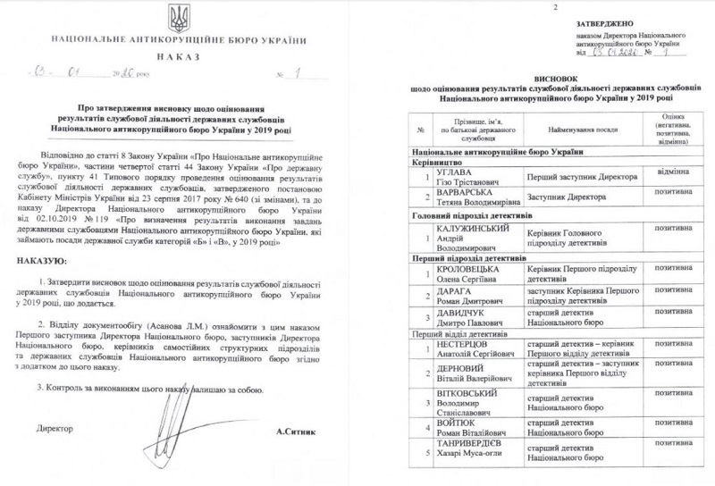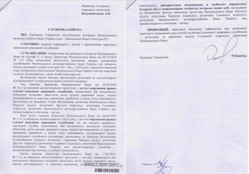 Управление внутреннего контроля НАБУ подтвердило участие работников бюро Калужинского, Литвиненко и Борисенко в коррупционных схемах в "Укроборонпроме", однако Артем Сытник приказом оценил их деятельность как "позитивную" и "отличную".