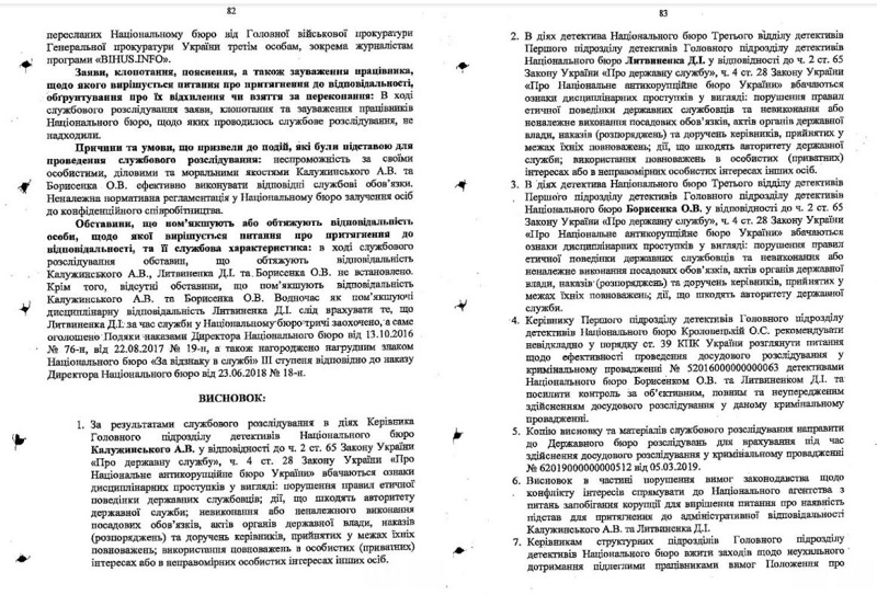 Информацию подтвердил журналист Владимир Бойко со ссылкой на документы НАБУ. Специализированная антикоррупционная прокуратура зарегистрировала по этому факту и передала для проведения досудебного расследования в ГБР уголовное производство, а Управление внутреннего контроля НАБУ в мае 2019 было вынуждено провести служебное расследование относительно Калужинского, Литвиненко и Борисенко. Вывод расследования был передан в НАПК для привлечения сотрудников НАБУ к ответственности за совершенные коррупционные правонарушения.