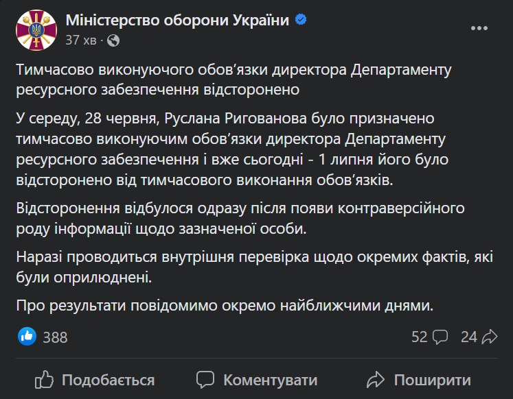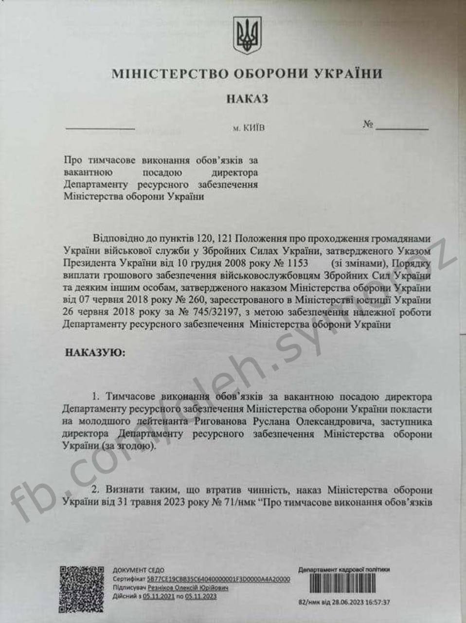 Он сообщил, что Рыгованов возглавил Департамент ресурсного обеспечения Минобороны Украины, показав соответствующий приказ министра обороны Алексея Резникова.