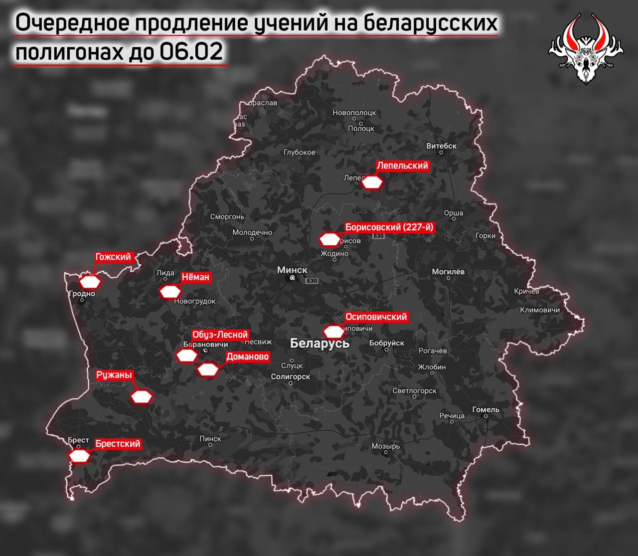 Отмечается, что 28-29 января будут выходными для некоторых полигонов, а остальные, где сконцентрировано российское войско, будут работать без перерыва. Речь идет об "Осиповичском", "Доманово", "Лепельском", "Обуз-Лесновском" и "Гожском" полигонах.