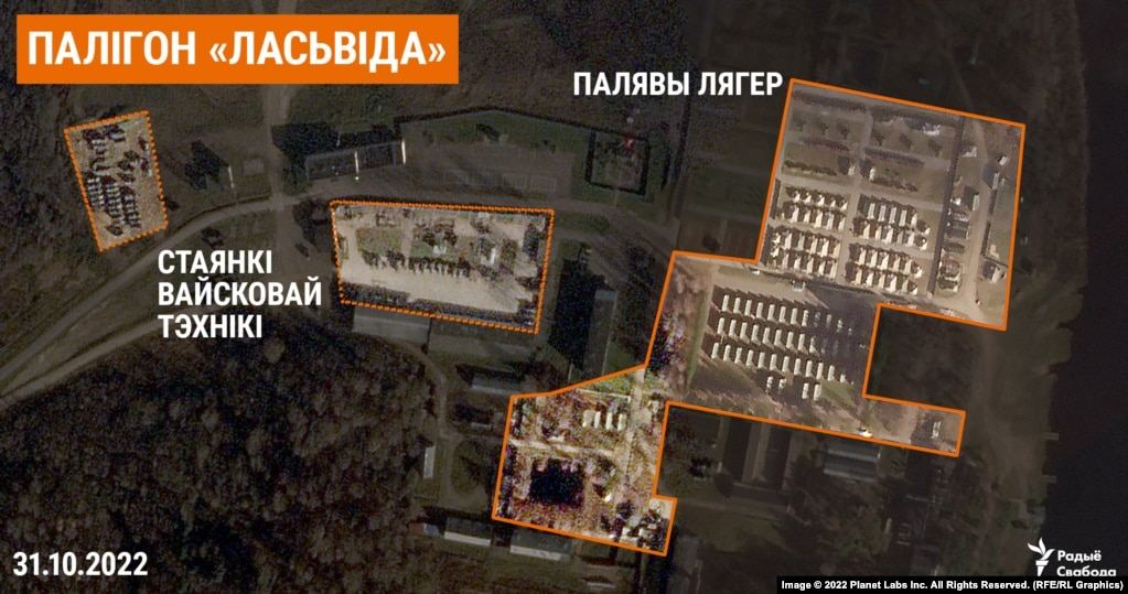 Кроме того, белорусская служба "Радио Свобода" поделилась спутниковыми снимками трех белорусских полигонов и аэродрома в Мачулищах. Они были сделаны компанией Planet Labs в период с 30 по 31 октября.