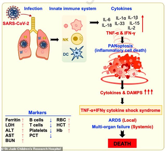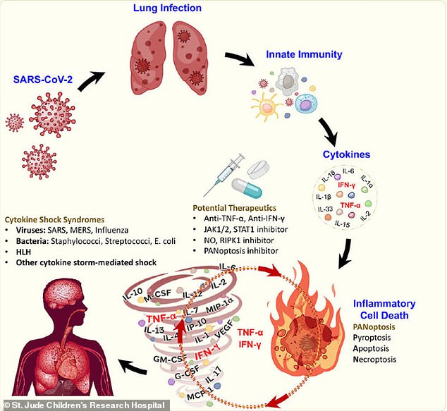 Было обнаружено, что вместе TNF-альфа и INF-гамма вызывают процесс, получивший название PANoptosis, который запускает три пути, убивающие клетки. Они называются пироптозом, апоптозом и некроптозом, и все они функционируют немного по-разному, но все являются специфическими механизмами, которые предназначены для уничтожения клеток. Идея состоит в том, что убивая клетки, они уничтожают и инфицированные, не позволяя вирусу достигать здоровых, незараженных участков.