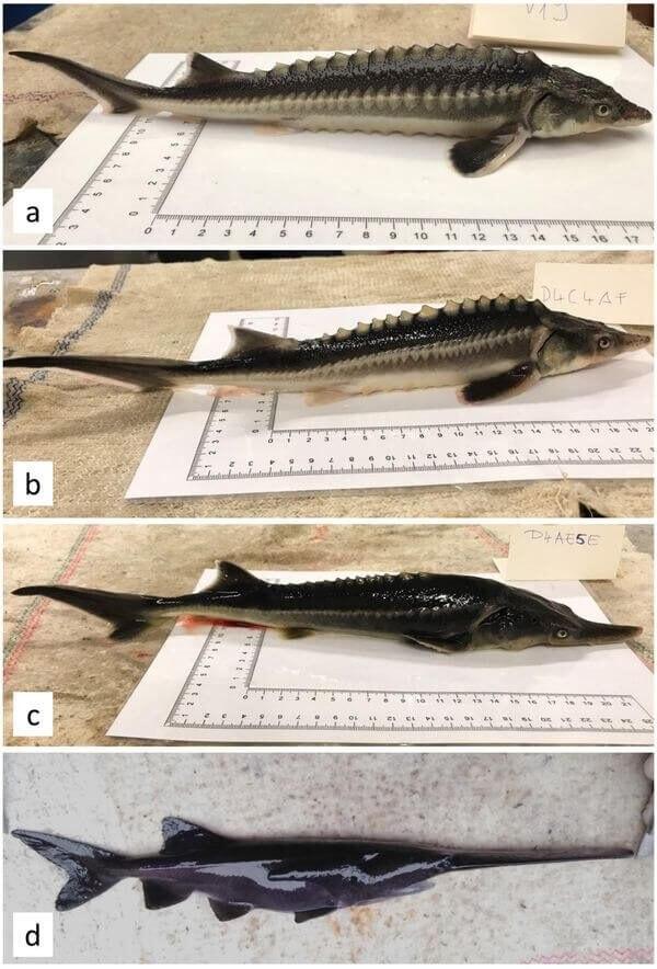 Но эксперимент принял неожиданный оборот. К их удивлению, российский осетр (Acipenser gueldenstaedtii) и американский веслонос (Polyodon spathula) дали потомство с генами обоих родителей. Так появился гибрид, который называли Sturddlefish (он изображен на фото b,c - "Апостроф").