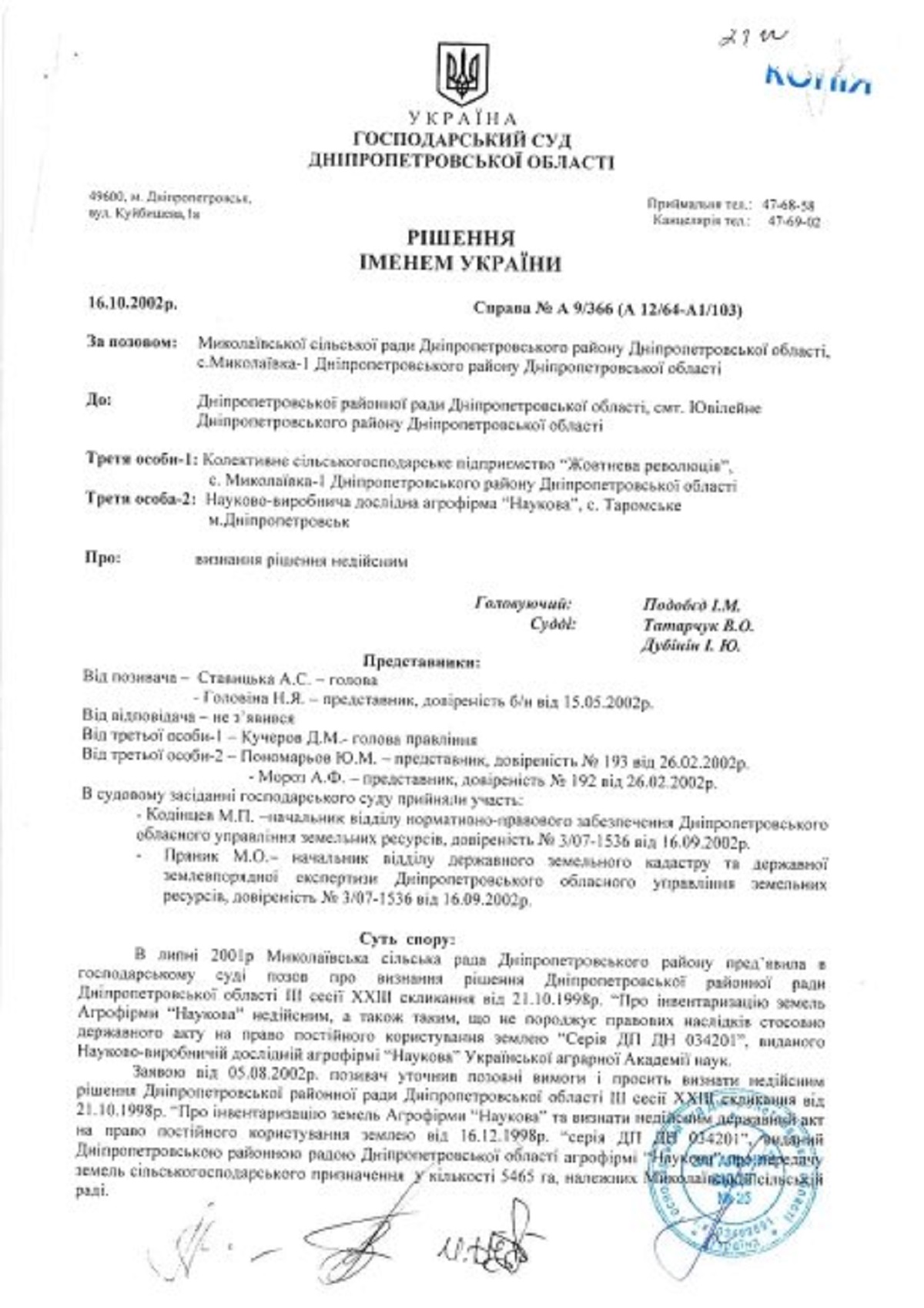 "Более 30 лет Агрофирма "Научная" пользуется большими массивами земель, которые расположены на территории Николаевской ОТГ, на основании государственного акта о праве на постоянное пользование землей, дважды признанном недействительным в судебном порядке. Так, по делу №А9/366 (А12/ 64-А1/103) решением Хозяйственного суда Днепропетровской области от 16 октября 2002, измененным постановлением Днепропетровского апелляционного хозсуда от 08 января 2003, а также решением этого же суда от 23.04.2023 по делу №Н32/20 (Н25/106 283) признан недействительным Государственный акт на право постоянного пользования землей серии ГП ДН 034201, выданным Агрофирме "Научная" Днепропетровским районным Советом народных депутатов Днепропетровского района Днепропетровской области 16.12.1998, в части передачи в постоянное землепользование земель, которые расположены в пределах Николаевского и Орджоникидзевского сельсоветов. Прикрываясь недействительным государственным актом, Агрофирма "Научная" создает для людей постоянные препятствия в передаче им в частную собственность земель для ведения личного хозяйства. При этом в течение последних десятилетий предприятие не проводит хозяйственной деятельности в этом районе, а все имущество, которое было в свое время предоставлено государством для функционирования предприятия, разрушено или приведено к упадку. Люди очень возмущены сложившейся ситуацией", – написал Геннадий Олешко.