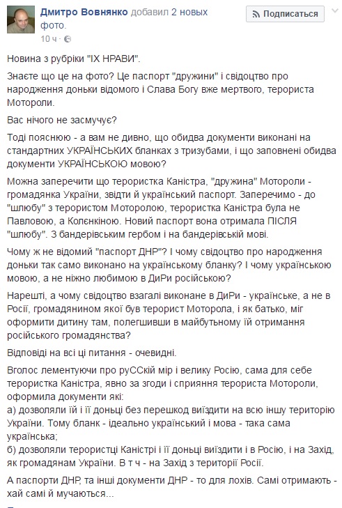 "Ты еще забыл про денежную помощь от Украины при рождении ребенка. Я не удивлюсь, если доброго слова не стоящая женщина еще и деньги получает на карточку...", "А никому не интересно, КАК и ГДЕ это было получено???", "А никому не интересно как не выезжая из Донецка учиться в автошколе на территории Украины, успешно сдать экзамены и получить украинское водительское удостоверение? Случай не единичный, цена двойная. Также и с паспортом", "Так для России она моторолке и не жена вовсе!", "все эти писульки ничего не стоят, если документы не проведены по базам. Сегодня любой может купить диплом любого вуза идентичен оригинальному, но есть одна проблема: такой "диплом" хорошо до первой сверки с базой данных. А бланков всяких много осталось, в том числе в Крыму", - комментируют публикацию журналиста пользователи соцсети.
