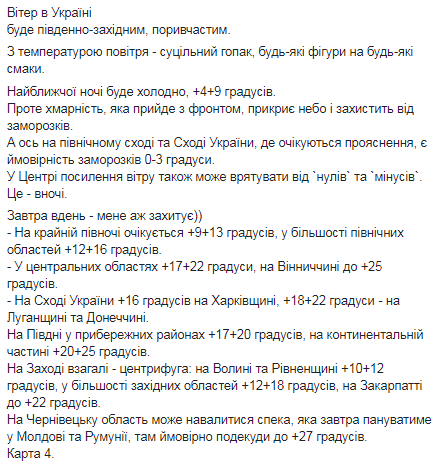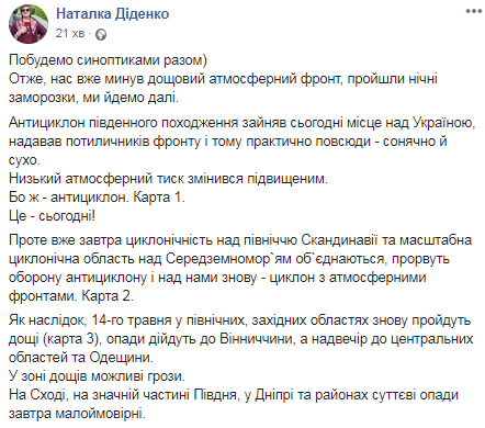 Об этом на своей странице в Facebook сообщает синоптик Наталка Диденко.