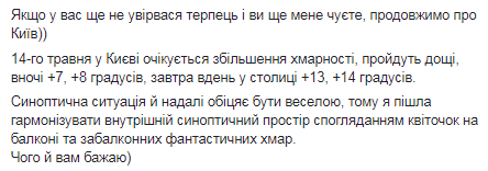 В Киеве 14 мая ожидаются дожди и +13 +14 градусов днем.