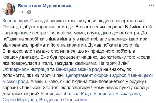 "Думал поехать в село под Винницей, но там уже ополчились, что как приедет его побьют в лучшем случае. Уже был прецедент на днях, жительницу того же села, которая вернулась из Италии, забросали камнями. На горячей линии Облгосадминистрации и Винницкого городского совета не знают, как помочь, как и на горячей линии Департамента здравоохранения Винницкого городского совета. А мне интересно, если человек все-таки вернется в семью и заразит близких. Кто тогда будет отвечать? Почему нет пункта изоляции для людей", - написала Мураховская.