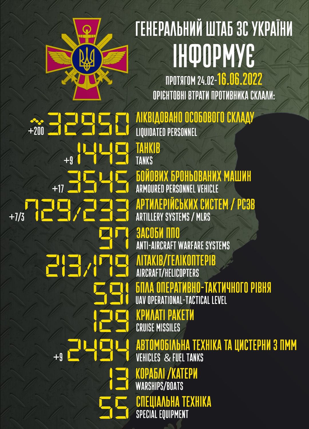- личного состава – около 32950 (+200) человек ликвидировано,