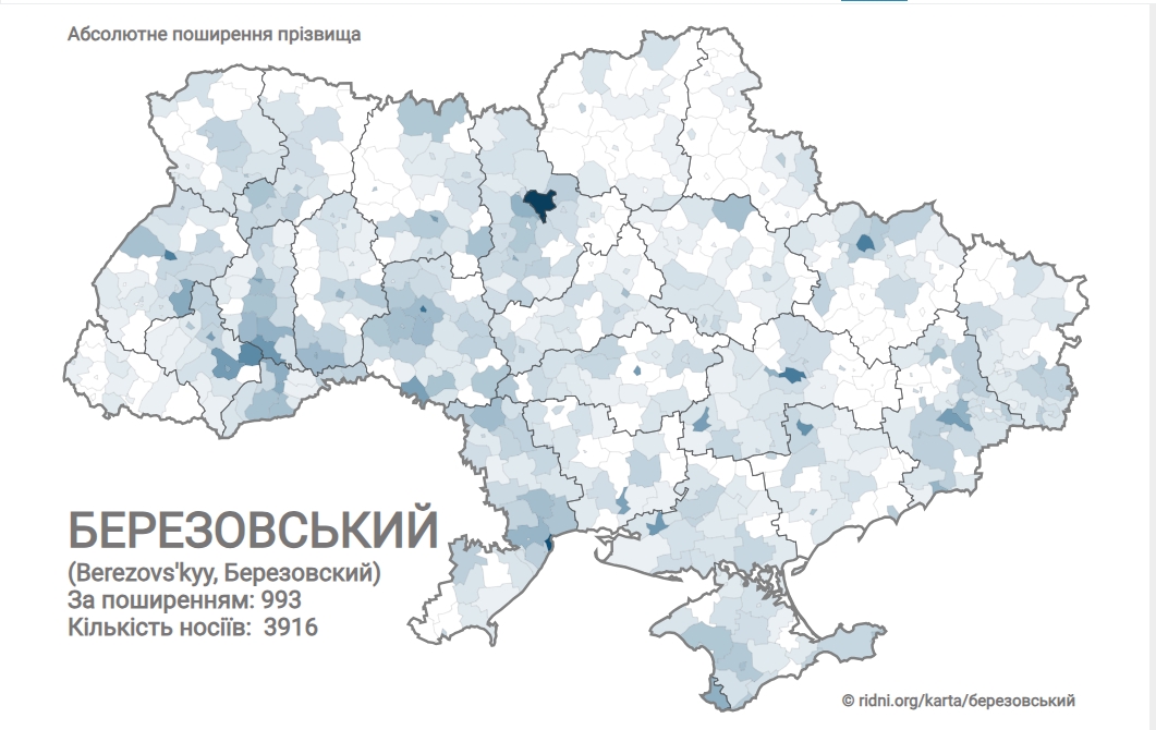 Так, фамилия Березовский насчитывает 3916 носителей в Украине. По распространению занимает 993 место. Чаще встречается на Галичине. Поселения компактного проживания: Киев (257), Одесса (149), Винница (89) Днепр (76), Харьков (73). Самые популярные имена: Александр, Михаил.