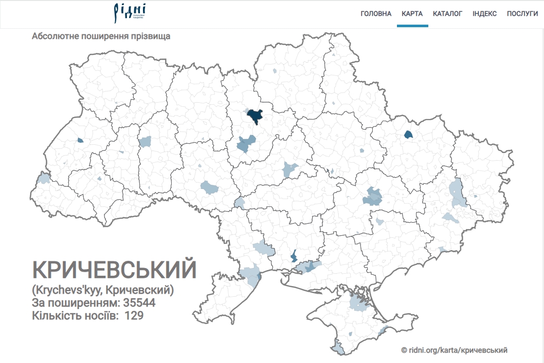 Фамилия Кричевский насчитывает 129 носителей. По распространению занимает 35 544 место. Чаще всего встречается на Приднепровье. Поселения компактного проживания: Киев (30), Харьков (11), Николаев (8) Львов (7), Белая Церковь (6). Самые популярные имена: Александр.
