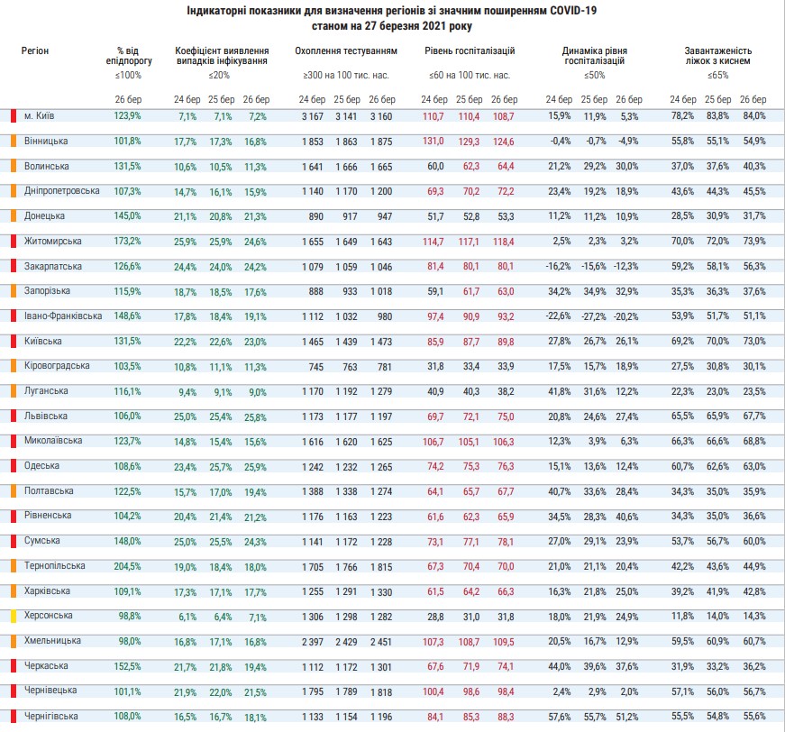 В субботу, 27 марта появилась информация о том, что в общий список добавилась Ровенская и Черниговская области. Общее количество регионов, которые оказались в "красной" зоне - 13. Отметим, что это необходимое число для введения в стране полного локдауна.