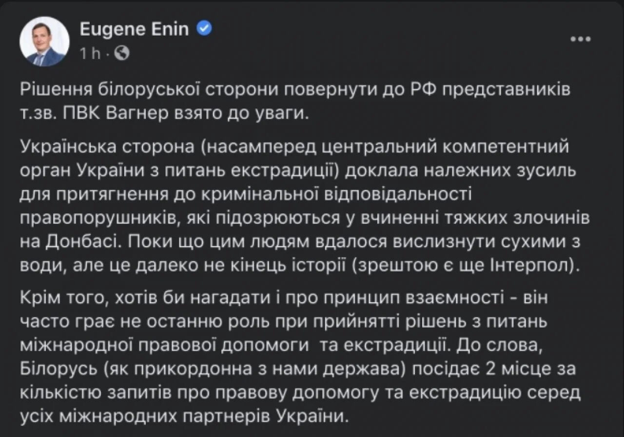 "Украина с сожалением воспринимает решение Республики Беларусь передать России ранее задержанную группу лиц, принадлежащих к частной военной компании "Вагнера".