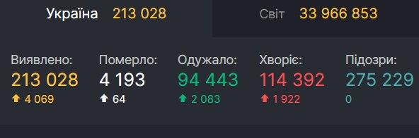 За прошедшиее сутки коронавирус диагностировали у 4 069 украинцев. Общее число больных в стране по состятнию на четверг, 1 октября, увеличилось до 213 028 человек.
