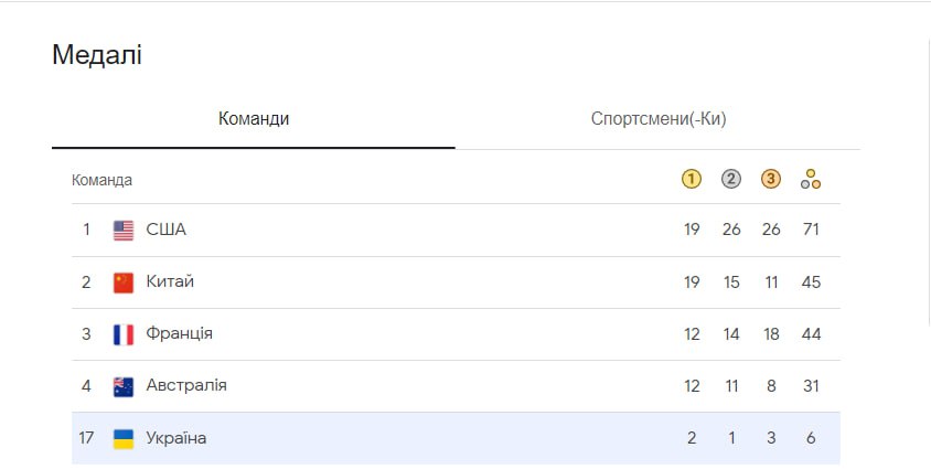 Сейчас Украина на 17 месте в медальном зачете Олимпиады-2024: