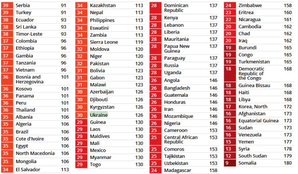На первом месте находятся такие страны западного мира, как Дания и Новая Зеландия: они заработали по 87 баллов. На 30-м месте – Испания (62 балла), на 35-м – Израиль (60 баллов). Панама и Перу - на 101-й позиции рейтинга восприятия коррупции (по 36 баллов). Последние места – 179-е и 180-е - достались Южному Судану и Сомали (12 и 9 баллов соответственно). Украина оказалась во второй половине рейтинга, среди стран с высоким уровнем коррупции: у нее - 126 место в списке (30 баллов). На данном уровне восприятия коррупции также оказались Киргизстан, Джибути, Азербайджан. Россия заняла 137 место, набрав 28 баллов из 100.