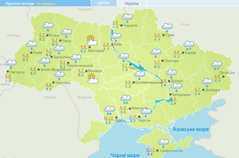 В субботу, 14 декабря, в Украине будет тепло, но дождливо.